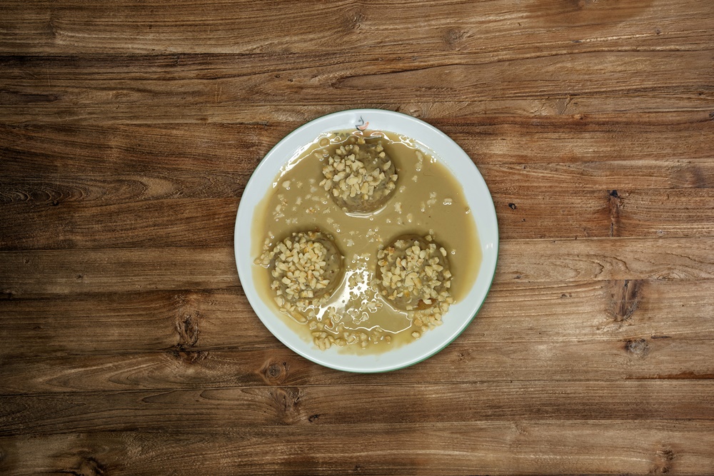 Özenle pişirilmiş kuzu beyni doğranır, üzerine zeytinyağı ve zeytin konularak servis edilir.